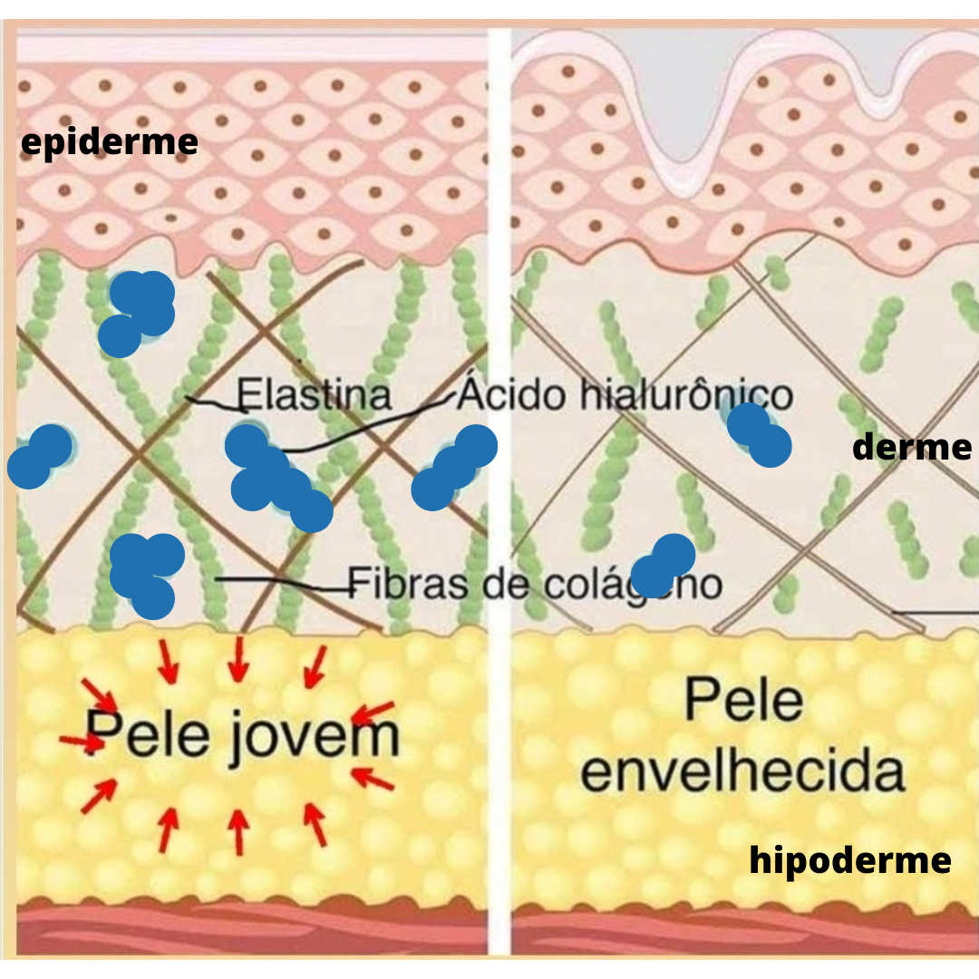 Observe uma pele jovem rica em colágeno, elastina e ÁCIDO HIALURÔNICO em contrapartida com uma pele envelhecida.