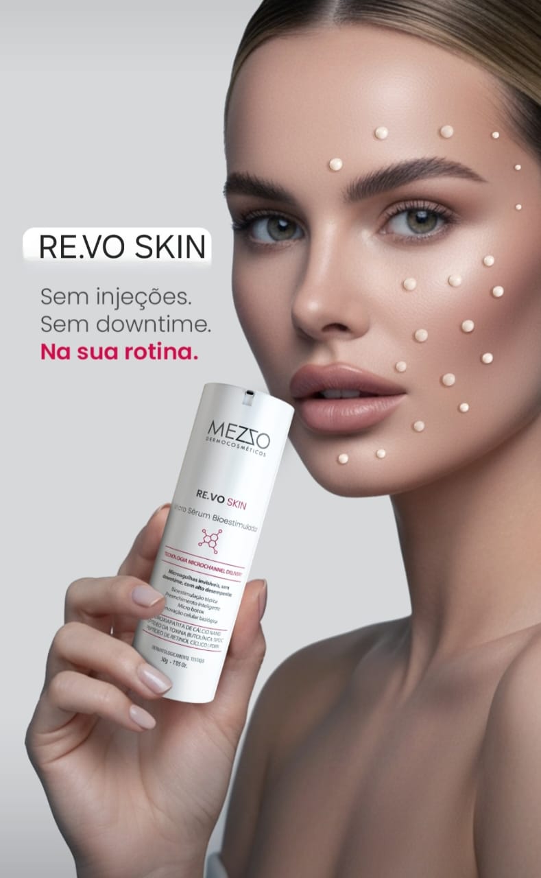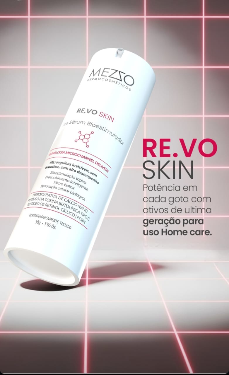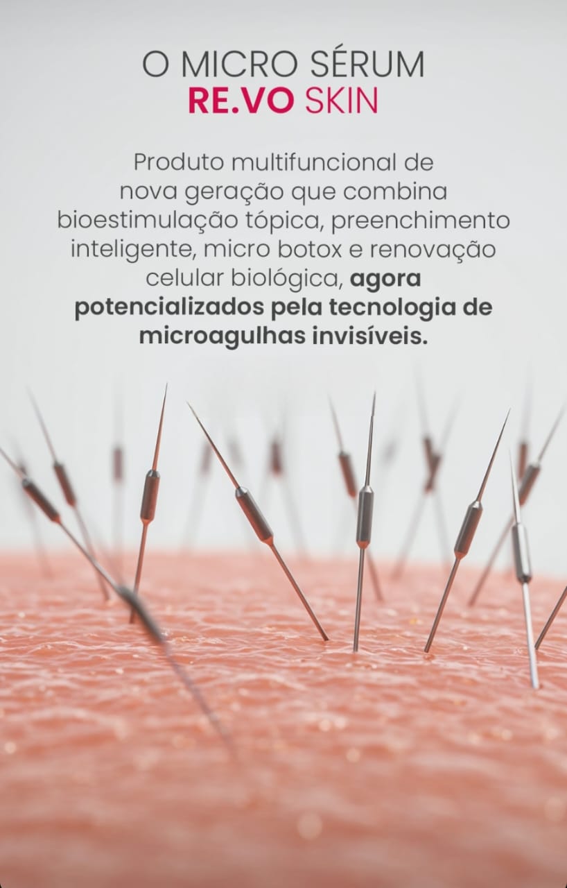 O micro sérum bioestimulador RE. VO SKIN home care é um produto multifuncional de nova geração, é a ciência em sua rotina, a combinação da bioestimulação tópica, preenchimento inteligente, micro Botox e renovação celular biológica, potencializando e complementando os resultados das sessões realizadas na clínica durante o seu tratamento. Uso noturno. Observe o comportamento de sua pele após a bioestimulação sem agulhas no tratamento NO PAIN.