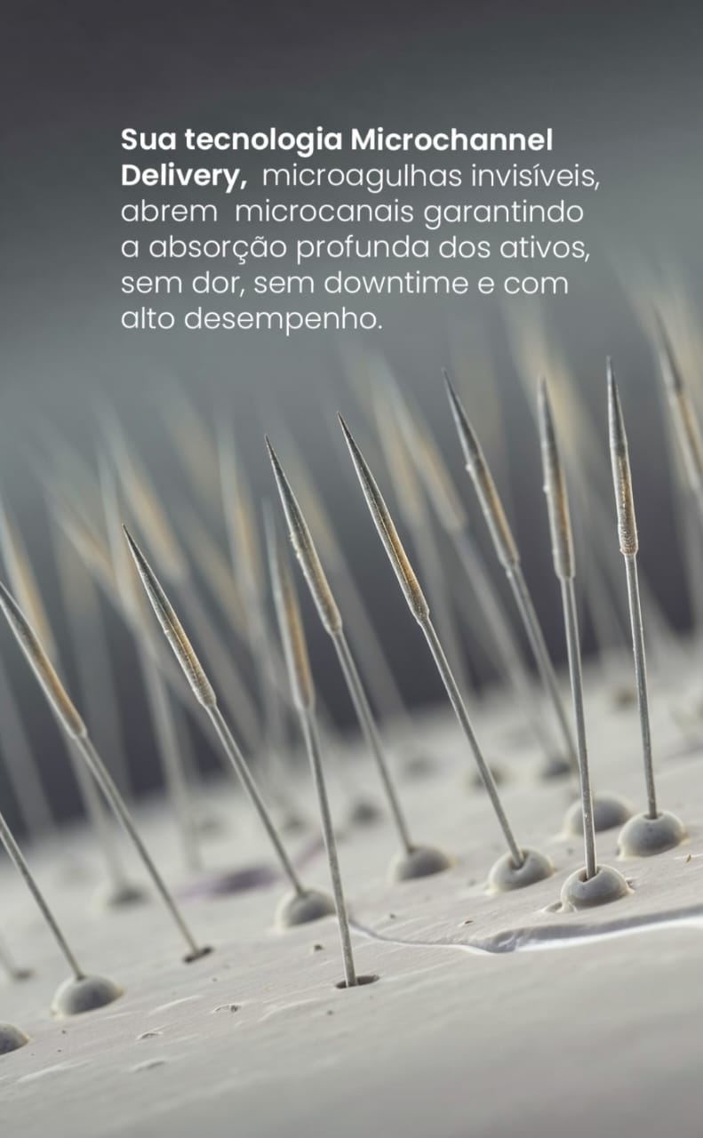 A tecnologia de micro agulhas invisíveis presentes nos biocosméticos, tanto durante o tratamento, como indicados para uso home care noturno, abrem micro canais, garantindo, dessa forma, a penetração profunda dos ativos, sem dor, sem desconforto, sem agressão ou inflamação indesejada, com alto desempenho e sem efeitos indesejados, pois não se usa agulhas e sim ciência e tecnologia agregada aos biocosméticos de última geração!